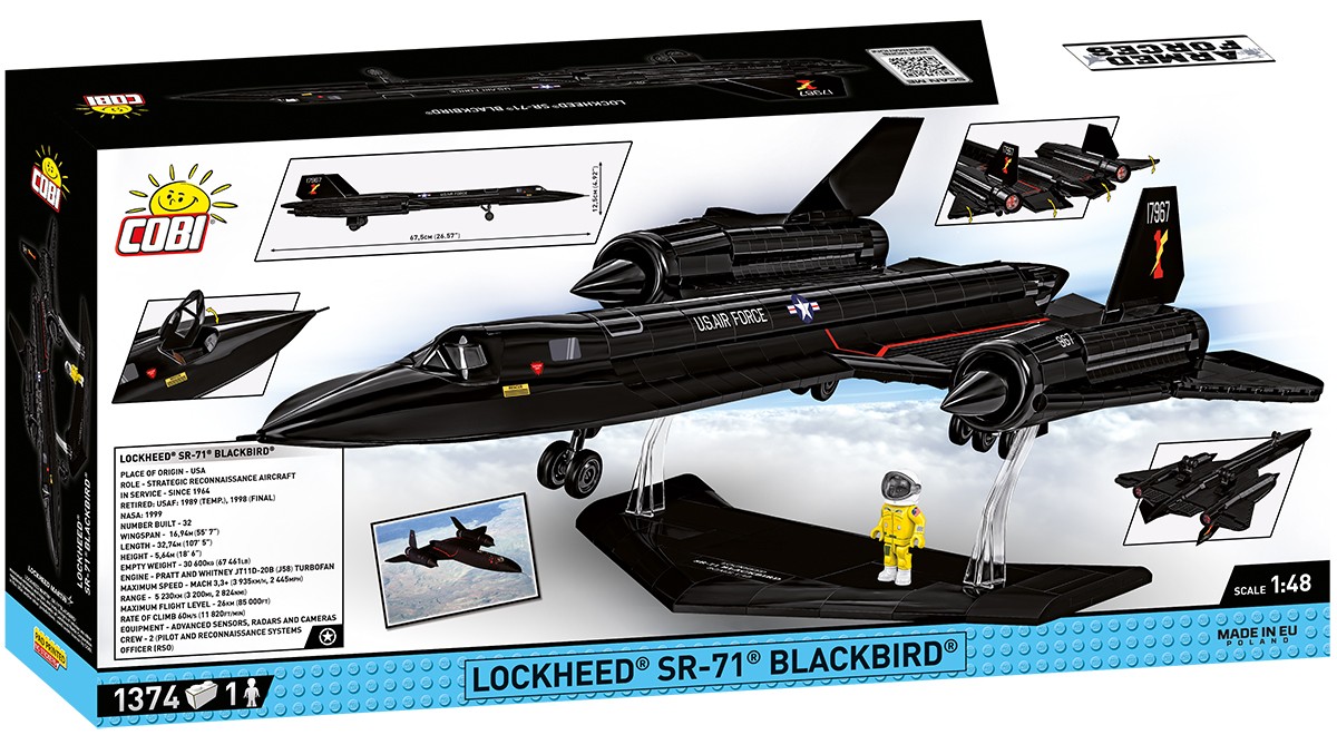 Blackbird optræder for første gang i COBI-udvalget. Sættet er omhyggeligt designet, så dets konstruktion vil give den krævende bygger stor tilfredsstillelse. Aftageligt landingsstel, bevægelige vingevinger og et cockpit, der kan åbnes med plads til figurer, er dets grundlæggende luftfartsfunktioner, som du vil opdage under konstruktionen. Modellen er beklædt med slidstærke tryk, der viser det amerikanske luftvåbens markeringer. Sættet indeholder også en USAF-pilotfigur i en karakteristisk uniform, der minder om astronautdragter!