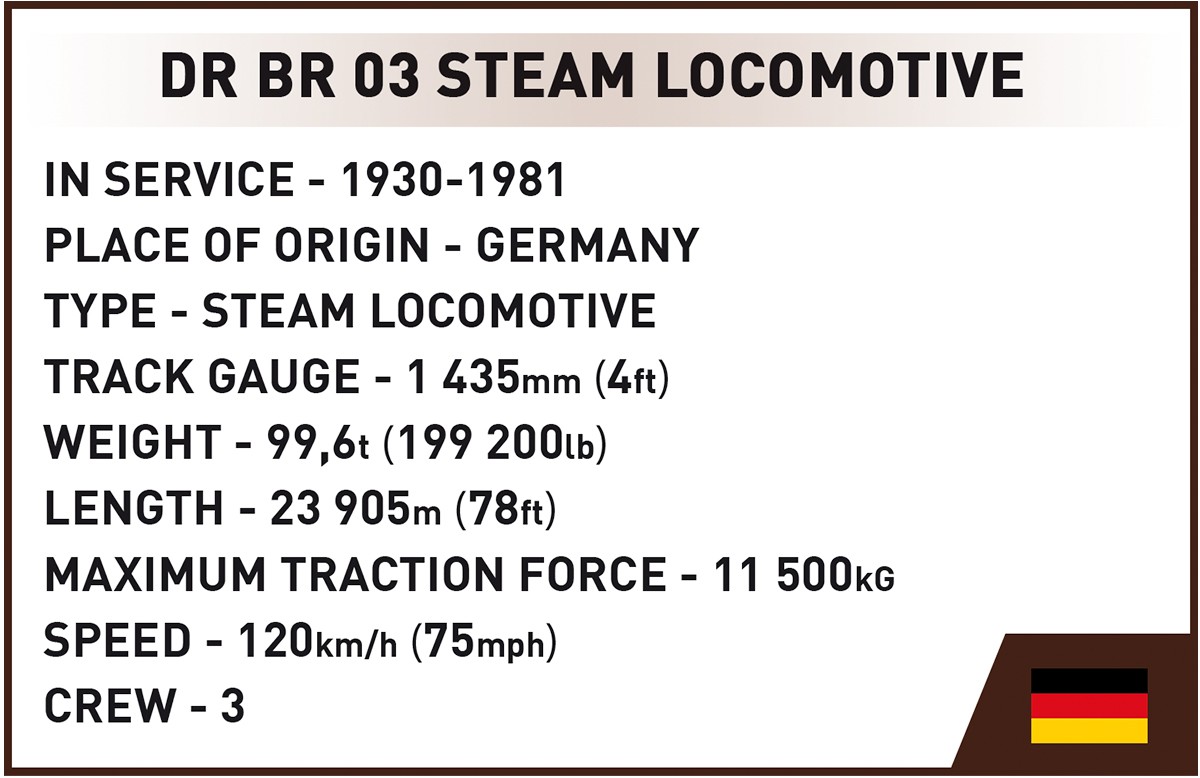 Modellen udgivet af COBI er BR03 273. Lokomotivet er næsten 70 centimeter langt og er lavet af 2700 elementer. De nye store hjul beregnet til ekspreslokomotiver fanger straks din opmærksomhed. Damplokomotivet har alle de vigtigste former fra sin originale model reproduceret. Den holdbare konstruktion gør lokomotivet tungt, men samtidig fungerer det perfekt. Systemet med roterende tandhjul placeret i rammen får hjulene forbundet med dampstemplet via spærre til at rotere som på et rigtigt lokomotiv. Interessante designfunktioner inkluderer: en reproduceret førerkabine med ildkammer, gasspjæld og andre elementer, der er vigtige for at styre lokomotivet, samt en røgkasse, der kan åbnes. Lokomotivet leveres med en bloktender, der er nødvendig for at køre et damplokomotiv. Den rigtige tender på BR03-lokomotivet rummede 32 kubikmeter vand og 10 tons kul. Bloktenderen er lavet på en interessant måde, fordi den har en aftagelig kullast. Takket være dette kan vores tender være tom eller fyldt med kul til randen. Modellen har detaljerede tryk, der viser lokomotivets markeringer, Deutsche Reichsbahn og de nødvendige tekniske tabeller.